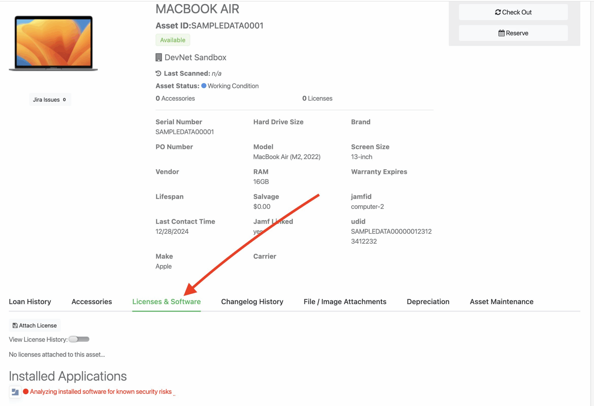 - Next, after assets have been added, view an asset such as a laptop and click the tab, “Licenses and Software”