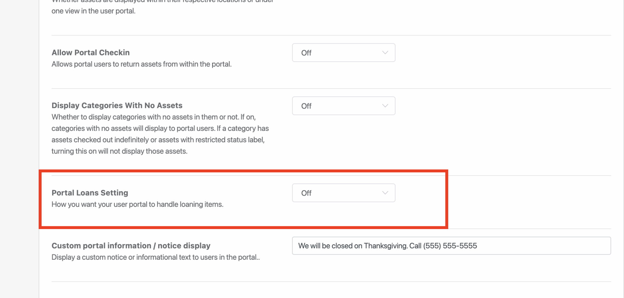 Step 2) Scroll down and find the setting “Portal Loans Settings” and set it to “Off“