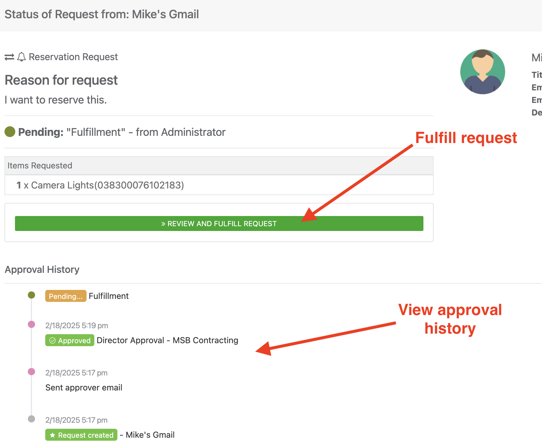 Click on the request. You’ll see a timeline of the history of approval steps. You can click “Review and Fulfill Request” if the request is currently in the last step.