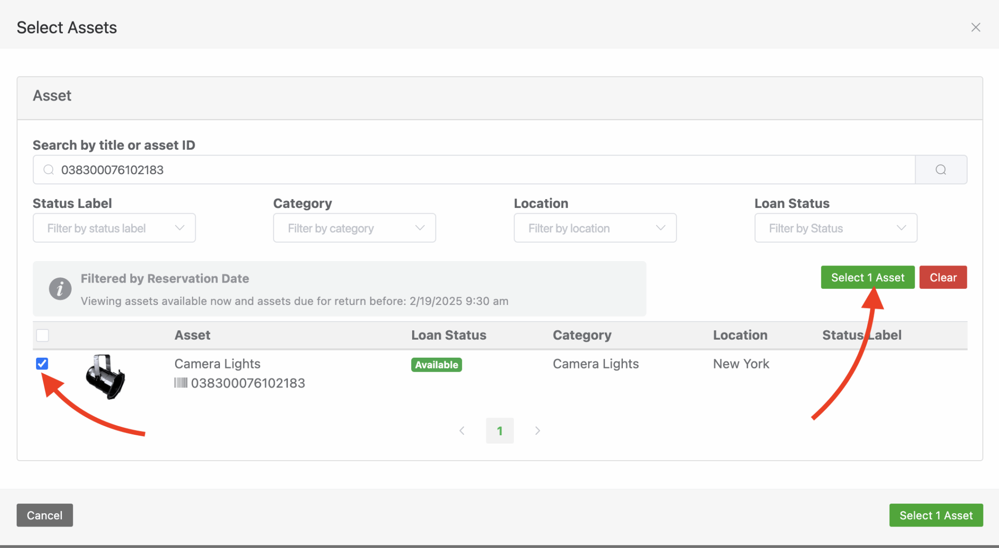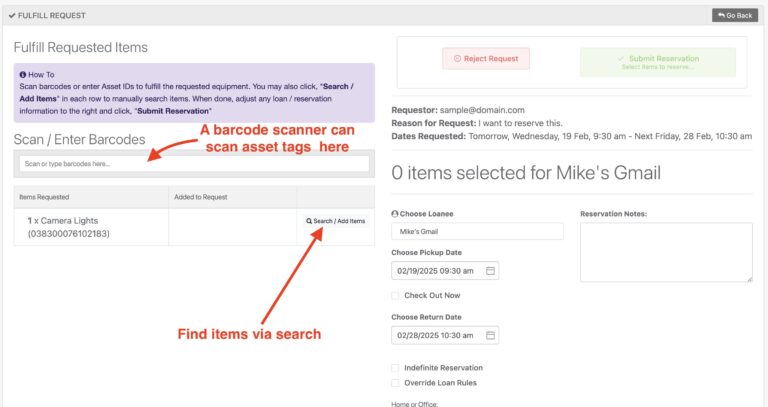 You’ll now need to fulfill the reservation by either scanning with a handheld scanner in the barcode input or, select the asset manually.