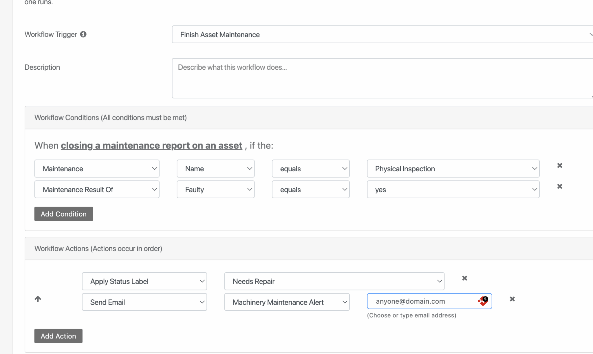 - Trigger = Finish Asset Maintenance