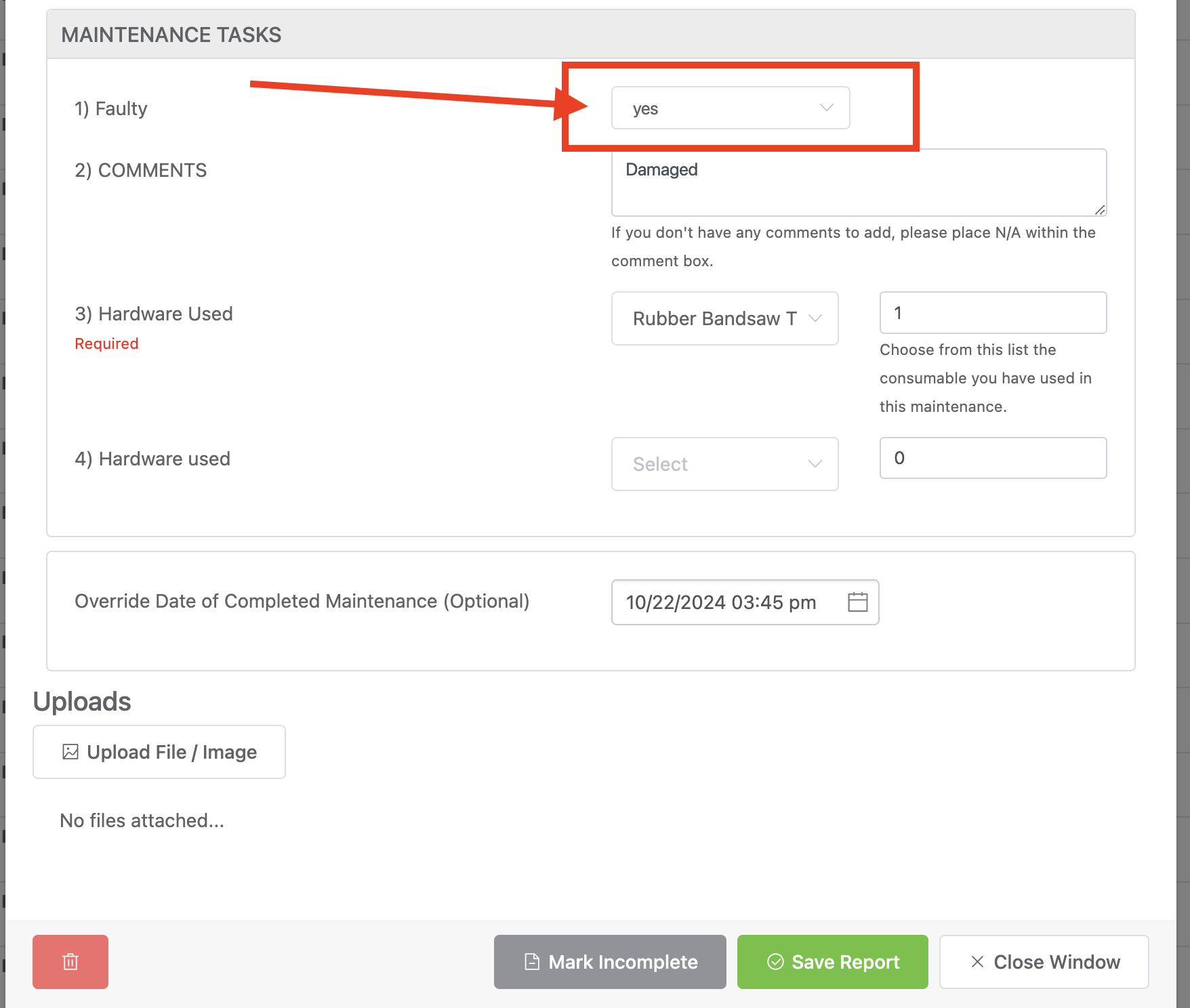- Maintenance result of faulty equals yes