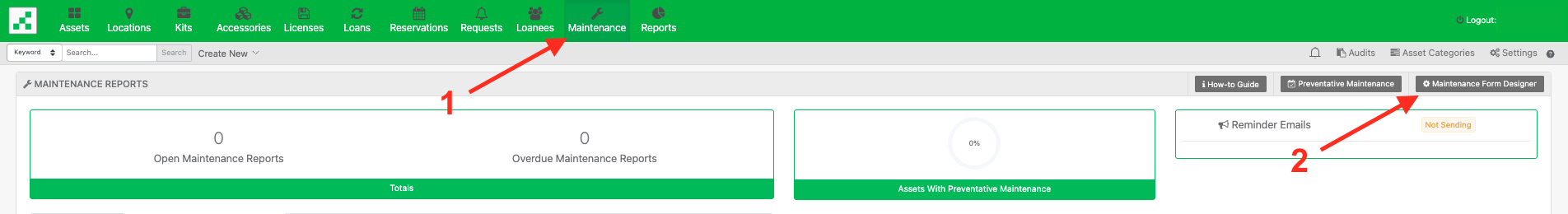 First you will want to go to the “Maintenance” tab at the top of Reftab. Within the Maintenance dashboard, click the “Maintenance Form Designer” button.