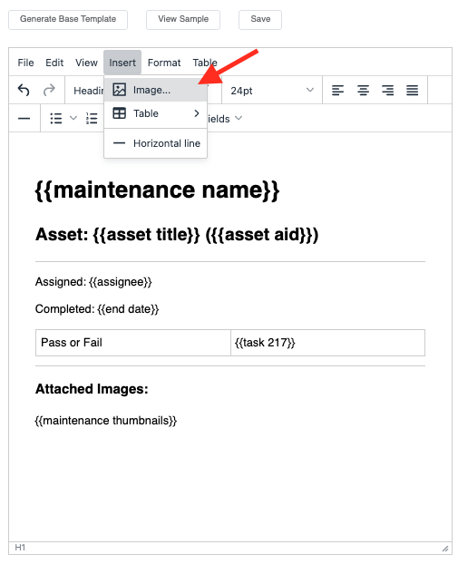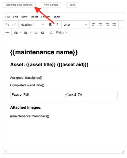 If this is your first time utilizing this feature, you can choose to generate a Base Template. Within the PDF Designer pop‐up, select “Generate Base Template”. This automatically inserts a sample layout with commonly used placeholder fields (e.g., {{assignee}}, {{asset title}}, etc.).