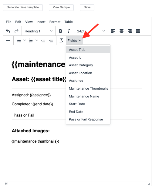 Click the “Fields” dropdown in the editor toolbar to see a list of available replacement fields (such as Asset Title, Asset ID, Start Date, etc.). Insert a field by selecting it; it will be placed where your cursor is in the editor.